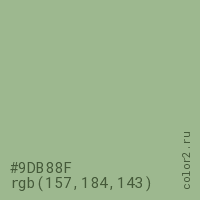 Цвет #9DB88F в цветовой модели RGB обозначается тремя октетами (157, 184, 143) в десятичном формате и #9DB88F в шестнадцатиричном (hex) формате, которые являются интенсивностью красного 157 (hex 9D), интенсивность зелёного 184 (hex B8) и интенсивность синего 143 (hex 8F).
