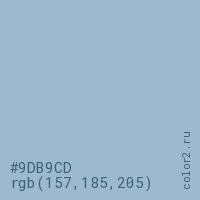 Цвет RGB(157, 185, 205) в процентом отношении количества цвета состоит из 61.6% красного (red), 72.5% зелёного (green) и 80.4% синего (blue).