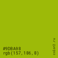 Цвет #9DBA08 в цветовой модели RGB обозначается тремя октетами (157, 186, 8) в десятичном формате и #9DBA08 в шестнадцатиричном (hex) формате, которые являются интенсивностью красного 157 (hex 9D), интенсивность зелёного 186 (hex BA) и интенсивность синего 8 (hex 08).