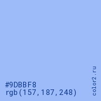 Цвет #9DBBF8 в цветовой модели RGB обозначается тремя октетами (157, 187, 248) в десятичном формате и #9DBBF8 в шестнадцатиричном (hex) формате, которые являются интенсивностью красного 157 (hex 9D), интенсивность зелёного 187 (hex BB) и интенсивность синего 248 (hex F8).