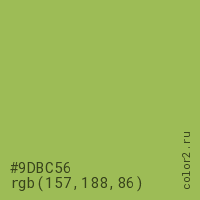 Цвет #9DBC56 в цветовой модели RGB обозначается тремя октетами (157, 188, 86) в десятичном формате и #9DBC56 в шестнадцатиричном (hex) формате, которые являются интенсивностью красного 157 (hex 9D), интенсивность зелёного 188 (hex BC) и интенсивность синего 86 (hex 56).