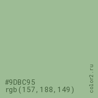 Цвет #9DBC95 в цветовой модели RGB обозначается тремя октетами (157, 188, 149) в десятичном формате и #9DBC95 в шестнадцатиричном (hex) формате, которые являются интенсивностью красного 157 (hex 9D), интенсивность зелёного 188 (hex BC) и интенсивность синего 149 (hex 95).