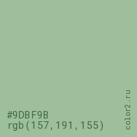 Цвет #9DBF9B в цветовой модели RGB обозначается тремя октетами (157, 191, 155) в десятичном формате и #9DBF9B в шестнадцатиричном (hex) формате, которые являются интенсивностью красного 157 (hex 9D), интенсивность зелёного 191 (hex BF) и интенсивность синего 155 (hex 9B).