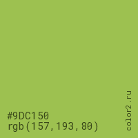 Цвет #9DC150 в цветовой модели RGB обозначается тремя октетами (157, 193, 80) в десятичном формате и #9DC150 в шестнадцатиричном (hex) формате, которые являются интенсивностью красного 157 (hex 9D), интенсивность зелёного 193 (hex C1) и интенсивность синего 80 (hex 50).