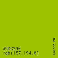 Цвет #9DC200 в цветовой модели RGB обозначается тремя октетами (157, 194, 0) в десятичном формате и #9DC200 в шестнадцатиричном (hex) формате, которые являются интенсивностью красного 157 (hex 9D), интенсивность зелёного 194 (hex C2) и интенсивность синего 0 (hex 00).
