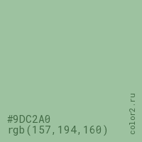 Цвет #9DC2A0 в цветовой модели RGB обозначается тремя октетами (157, 194, 160) в десятичном формате и #9DC2A0 в шестнадцатиричном (hex) формате, которые являются интенсивностью красного 157 (hex 9D), интенсивность зелёного 194 (hex C2) и интенсивность синего 160 (hex A0).