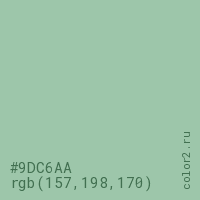 Цвет #9DC6AA в цветовой модели RGB обозначается тремя октетами (157, 198, 170) в десятичном формате и #9DC6AA в шестнадцатиричном (hex) формате, которые являются интенсивностью красного 157 (hex 9D), интенсивность зелёного 198 (hex C6) и интенсивность синего 170 (hex AA).