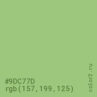 Цвет #9DC77D в цветовой модели RGB обозначается тремя октетами (157, 199, 125) в десятичном формате и #9DC77D в шестнадцатиричном (hex) формате, которые являются интенсивностью красного 157 (hex 9D), интенсивность зелёного 199 (hex C7) и интенсивность синего 125 (hex 7D).