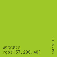 Цвет #9DC828 в цветовой модели RGB обозначается тремя октетами (157, 200, 40) в десятичном формате и #9DC828 в шестнадцатиричном (hex) формате, которые являются интенсивностью красного 157 (hex 9D), интенсивность зелёного 200 (hex C8) и интенсивность синего 40 (hex 28).
