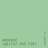 Цвет #9DCB9F в цветовой модели RGB обозначается тремя октетами (157, 203, 159) в десятичном формате и #9DCB9F в шестнадцатиричном (hex) формате, которые являются интенсивностью красного 157 (hex 9D), интенсивность зелёного 203 (hex CB) и интенсивность синего 159 (hex 9F).