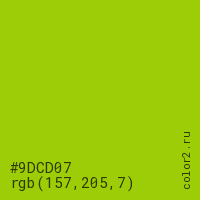 Цвет #9DCD07 в цветовой модели RGB обозначается тремя октетами (157, 205, 7) в десятичном формате и #9DCD07 в шестнадцатиричном (hex) формате, которые являются интенсивностью красного 157 (hex 9D), интенсивность зелёного 205 (hex CD) и интенсивность синего 7 (hex 07).