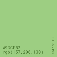 Цвет #9DCE82 в цветовой модели RGB обозначается тремя октетами (157, 206, 130) в десятичном формате и #9DCE82 в шестнадцатиричном (hex) формате, которые являются интенсивностью красного 157 (hex 9D), интенсивность зелёного 206 (hex CE) и интенсивность синего 130 (hex 82).