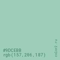 Цвет #9DCEBB в цветовой модели RGB обозначается тремя октетами (157, 206, 187) в десятичном формате и #9DCEBB в шестнадцатиричном (hex) формате, которые являются интенсивностью красного 157 (hex 9D), интенсивность зелёного 206 (hex CE) и интенсивность синего 187 (hex BB).