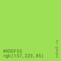 Цвет #9DDF55 в цветовой модели RGB обозначается тремя октетами (157, 223, 85) в десятичном формате и #9DDF55 в шестнадцатиричном (hex) формате, которые являются интенсивностью красного 157 (hex 9D), интенсивность зелёного 223 (hex DF) и интенсивность синего 85 (hex 55).