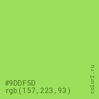 Цвет #9DDF5D в цветовой модели RGB обозначается тремя октетами (157, 223, 93) в десятичном формате и #9DDF5D в шестнадцатиричном (hex) формате, которые являются интенсивностью красного 157 (hex 9D), интенсивность зелёного 223 (hex DF) и интенсивность синего 93 (hex 5D).