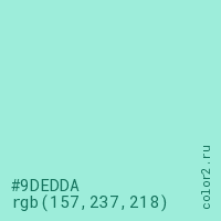 Цвет #9DEDDA в цветовой модели RGB обозначается тремя октетами (157, 237, 218) в десятичном формате и #9DEDDA в шестнадцатиричном (hex) формате, которые являются интенсивностью красного 157 (hex 9D), интенсивность зелёного 237 (hex ED) и интенсивность синего 218 (hex DA).