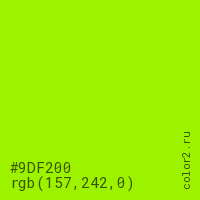 Цвет #9DF200 в цветовой модели RGB обозначается тремя октетами (157, 242, 0) в десятичном формате и #9DF200 в шестнадцатиричном (hex) формате, которые являются интенсивностью красного 157 (hex 9D), интенсивность зелёного 242 (hex F2) и интенсивность синего 0 (hex 00).