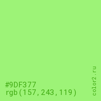 Цвет #9DF377 в цветовой модели RGB обозначается тремя октетами (157, 243, 119) в десятичном формате и #9DF377 в шестнадцатиричном (hex) формате, которые являются интенсивностью красного 157 (hex 9D), интенсивность зелёного 243 (hex F3) и интенсивность синего 119 (hex 77).