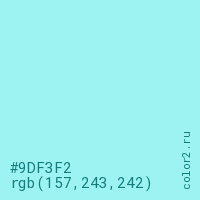 Цвет #9DF3F2 в цветовой модели RGB обозначается тремя октетами (157, 243, 242) в десятичном формате и #9DF3F2 в шестнадцатиричном (hex) формате, которые являются интенсивностью красного 157 (hex 9D), интенсивность зелёного 243 (hex F3) и интенсивность синего 242 (hex F2).