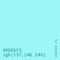Цвет #9DF6F5 в цветовой модели RGB обозначается тремя октетами (157, 246, 245) в десятичном формате и #9DF6F5 в шестнадцатиричном (hex) формате, которые являются интенсивностью красного 157 (hex 9D), интенсивность зелёного 246 (hex F6) и интенсивность синего 245 (hex F5).