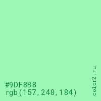 Цвет #9DF8B8 в цветовой модели RGB обозначается тремя октетами (157, 248, 184) в десятичном формате и #9DF8B8 в шестнадцатиричном (hex) формате, которые являются интенсивностью красного 157 (hex 9D), интенсивность зелёного 248 (hex F8) и интенсивность синего 184 (hex B8).