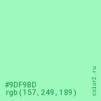 Цвет RGB(157, 249, 189) в процентом отношении количества цвета состоит из 61.6% красного (red), 97.6% зелёного (green) и 74.1% синего (blue).