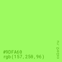 Цвет #9DFA60 в цветовой модели RGB обозначается тремя октетами (157, 250, 96) в десятичном формате и #9DFA60 в шестнадцатиричном (hex) формате, которые являются интенсивностью красного 157 (hex 9D), интенсивность зелёного 250 (hex FA) и интенсивность синего 96 (hex 60).