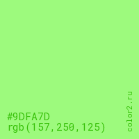 Цвет #9DFA7D в цветовой модели RGB обозначается тремя октетами (157, 250, 125) в десятичном формате и #9DFA7D в шестнадцатиричном (hex) формате, которые являются интенсивностью красного 157 (hex 9D), интенсивность зелёного 250 (hex FA) и интенсивность синего 125 (hex 7D).