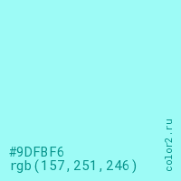 Цвет #9DFBF6 в цветовой модели RGB обозначается тремя октетами (157, 251, 246) в десятичном формате и #9DFBF6 в шестнадцатиричном (hex) формате, которые являются интенсивностью красного 157 (hex 9D), интенсивность зелёного 251 (hex FB) и интенсивность синего 246 (hex F6).