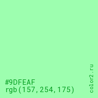 Цвет #9DFEAF в цветовой модели RGB обозначается тремя октетами (157, 254, 175) в десятичном формате и #9DFEAF в шестнадцатиричном (hex) формате, которые являются интенсивностью красного 157 (hex 9D), интенсивность зелёного 254 (hex FE) и интенсивность синего 175 (hex AF).