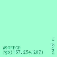 Цвет #9DFECF в цветовой модели RGB обозначается тремя октетами (157, 254, 207) в десятичном формате и #9DFECF в шестнадцатиричном (hex) формате, которые являются интенсивностью красного 157 (hex 9D), интенсивность зелёного 254 (hex FE) и интенсивность синего 207 (hex CF).