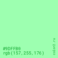 Цвет #9DFFB0 в цветовой модели RGB обозначается тремя октетами (157, 255, 176) в десятичном формате и #9DFFB0 в шестнадцатиричном (hex) формате, которые являются интенсивностью красного 157 (hex 9D), интенсивность зелёного 255 (hex FF) и интенсивность синего 176 (hex B0).