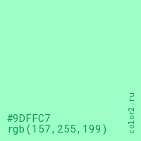 Цвет #9DFFC7 в цветовой модели RGB обозначается тремя октетами (157, 255, 199) в десятичном формате и #9DFFC7 в шестнадцатиричном (hex) формате, которые являются интенсивностью красного 157 (hex 9D), интенсивность зелёного 255 (hex FF) и интенсивность синего 199 (hex C7).