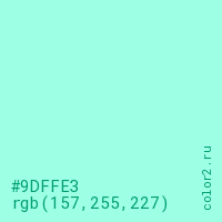Цвет #9DFFE3 в цветовой модели RGB обозначается тремя октетами (157, 255, 227) в десятичном формате и #9DFFE3 в шестнадцатиричном (hex) формате, которые являются интенсивностью красного 157 (hex 9D), интенсивность зелёного 255 (hex FF) и интенсивность синего 227 (hex E3).