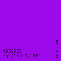 Цвет #9E09EB в цветовой модели RGB обозначается тремя октетами (158, 9, 235) в десятичном формате и #9E09EB в шестнадцатиричном (hex) формате, которые являются интенсивностью красного 158 (hex 9E), интенсивность зелёного 9 (hex 09) и интенсивность синего 235 (hex EB).