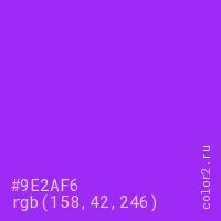 Цвет #9E2AF6 в цветовой модели RGB обозначается тремя октетами (158, 42, 246) в десятичном формате и #9E2AF6 в шестнадцатиричном (hex) формате, которые являются интенсивностью красного 158 (hex 9E), интенсивность зелёного 42 (hex 2A) и интенсивность синего 246 (hex F6).
