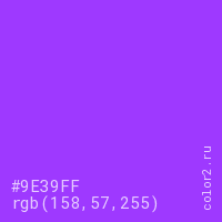 Цвет #9E39FF в цветовой модели RGB обозначается тремя октетами (158, 57, 255) в десятичном формате и #9E39FF в шестнадцатиричном (hex) формате, которые являются интенсивностью красного 158 (hex 9E), интенсивность зелёного 57 (hex 39) и интенсивность синего 255 (hex FF).
