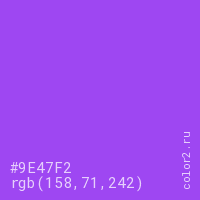 Цвет #9E47F2 в цветовой модели RGB обозначается тремя октетами (158, 71, 242) в десятичном формате и #9E47F2 в шестнадцатиричном (hex) формате, которые являются интенсивностью красного 158 (hex 9E), интенсивность зелёного 71 (hex 47) и интенсивность синего 242 (hex F2).