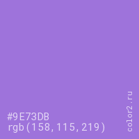 Цвет #9E73DB в цветовой модели RGB обозначается тремя октетами (158, 115, 219) в десятичном формате и #9E73DB в шестнадцатиричном (hex) формате, которые являются интенсивностью красного 158 (hex 9E), интенсивность зелёного 115 (hex 73) и интенсивность синего 219 (hex DB).
