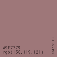 Цвет #9E7779 в цветовой модели RGB обозначается тремя октетами (158, 119, 121) в десятичном формате и #9E7779 в шестнадцатиричном (hex) формате, которые являются интенсивностью красного 158 (hex 9E), интенсивность зелёного 119 (hex 77) и интенсивность синего 121 (hex 79).