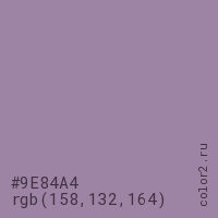 Цвет #9E84A4 в цветовой модели RGB обозначается тремя октетами (158, 132, 164) в десятичном формате и #9E84A4 в шестнадцатиричном (hex) формате, которые являются интенсивностью красного 158 (hex 9E), интенсивность зелёного 132 (hex 84) и интенсивность синего 164 (hex A4).