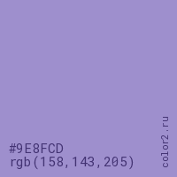Цвет #9E8FCD в цветовой модели RGB обозначается тремя октетами (158, 143, 205) в десятичном формате и #9E8FCD в шестнадцатиричном (hex) формате, которые являются интенсивностью красного 158 (hex 9E), интенсивность зелёного 143 (hex 8F) и интенсивность синего 205 (hex CD).