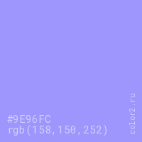 Цвет #9E96FC в цветовой модели RGB обозначается тремя октетами (158, 150, 252) в десятичном формате и #9E96FC в шестнадцатиричном (hex) формате, которые являются интенсивностью красного 158 (hex 9E), интенсивность зелёного 150 (hex 96) и интенсивность синего 252 (hex FC).