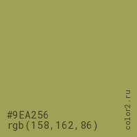 Цвет #9EA256 в цветовой модели RGB обозначается тремя октетами (158, 162, 86) в десятичном формате и #9EA256 в шестнадцатиричном (hex) формате, которые являются интенсивностью красного 158 (hex 9E), интенсивность зелёного 162 (hex A2) и интенсивность синего 86 (hex 56).
