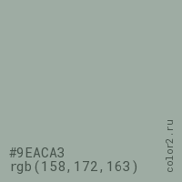 Цвет #9EACA3 в цветовой модели RGB обозначается тремя октетами (158, 172, 163) в десятичном формате и #9EACA3 в шестнадцатиричном (hex) формате, которые являются интенсивностью красного 158 (hex 9E), интенсивность зелёного 172 (hex AC) и интенсивность синего 163 (hex A3).