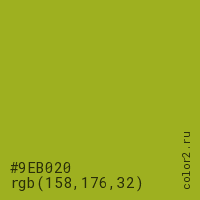 Цвет #9EB020 в цветовой модели RGB обозначается тремя октетами (158, 176, 32) в десятичном формате и #9EB020 в шестнадцатиричном (hex) формате, которые являются интенсивностью красного 158 (hex 9E), интенсивность зелёного 176 (hex B0) и интенсивность синего 32 (hex 20).