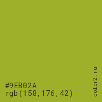 Цвет #9EB02A в цветовой модели RGB обозначается тремя октетами (158, 176, 42) в десятичном формате и #9EB02A в шестнадцатиричном (hex) формате, которые являются интенсивностью красного 158 (hex 9E), интенсивность зелёного 176 (hex B0) и интенсивность синего 42 (hex 2A).