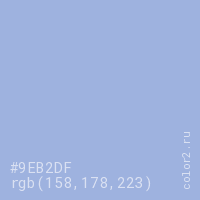 Цвет #9EB2DF в цветовой модели RGB обозначается тремя октетами (158, 178, 223) в десятичном формате и #9EB2DF в шестнадцатиричном (hex) формате, которые являются интенсивностью красного 158 (hex 9E), интенсивность зелёного 178 (hex B2) и интенсивность синего 223 (hex DF).