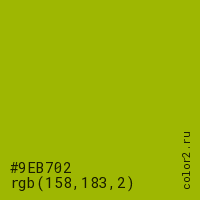 Цвет #9EB702 в цветовой модели RGB обозначается тремя октетами (158, 183, 2) в десятичном формате и #9EB702 в шестнадцатиричном (hex) формате, которые являются интенсивностью красного 158 (hex 9E), интенсивность зелёного 183 (hex B7) и интенсивность синего 2 (hex 02).
