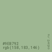 Цвет #9EB792 в цветовой модели RGB обозначается тремя октетами (158, 183, 146) в десятичном формате и #9EB792 в шестнадцатиричном (hex) формате, которые являются интенсивностью красного 158 (hex 9E), интенсивность зелёного 183 (hex B7) и интенсивность синего 146 (hex 92).